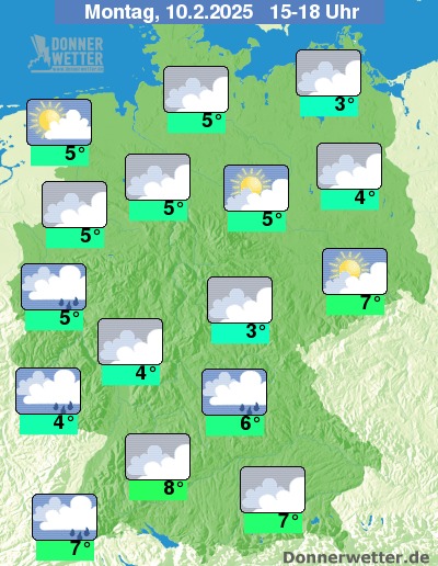 Die Temperaturen erreichen am Nachmittag Höchstwerte um 3 Grad im Thüringer Becken und 7 Grad am Alpenrand.