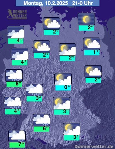 In der Nacht zum Dienstag zeigt sich der Himmel über der Westhälfte sowie im Nordwesten und Südwesten stark bewölkt oder es ist bedeckt; dabei fällt verbreitet Regen, nach Süden hin auch gefrierend. Im Nordwesten auch Schneeregen oder Schnee mit lokaler Glättegefahr. Im Osten und Nordosten bleibt es bei geringer Bewölkung oder sternenklarem Himmel trocken.