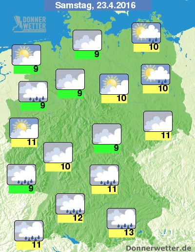 Am Samstag bleibt es im Süden bedeckt und es fällt häufig Regen, in den anderen Landesteilen ziehen gebietsweise auch dichte Wolken durch, regional - und vor allem im Norden - ist es aber auch heiter, dabei sind nur einzelne Schauer möglich. Es werden 9 bis 13 Grad erreicht.