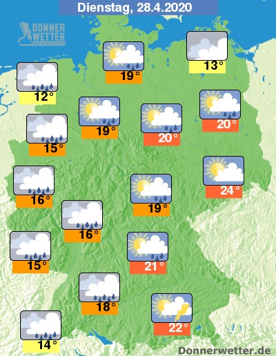 Die Temperaturen liegen im Südwesten und Westen, sowie im Küstenbereich von Nord- und Ostsee meist nur noch zwischen 12 und 17 Grad. Im übrigen Land werden nochmals frühlingshafte 18 bis 22 Grad, in Teilen Sachsens, sowie am Inn sogar bis zu 25 Grad erreicht