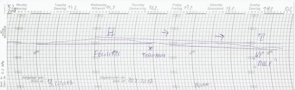 Unser Schrieb zeigt den Luftdruckverlauf zwischen dem 13. und 19.02.2017. Gut zu erkennen ist das schwächelnde Hoch "Felicitas" mit dem Trendbruch am Donnerstag. Ab nun übernimmt Tief "Rolf" die Wetterregie.