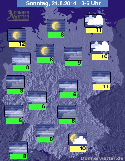 In der kommenden Nacht treten in der Osthälfte des Landes noch gebietsweise Schauer auf, sonst ist der Himmel aber meist schon aufgelockert bewölkt, zumeist sogar sternenklar und es ist bereits trocken. Ab der zweiten Nachthälfte klingen auch die Schauer im Osten nach und nach ab und der Himmel klart weitgehend auf. Stellenweise bildet sich Nebel oder Hochnebel. Die Tiefstwerte erreichen 12 Grad im Emsland und sehr kühle 6 Grad im Taunus.