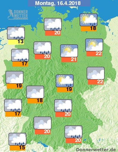 Am Montag ist es wiederum sehr wechselhaft mit meist vielen und oft dichten Wolken und gebietsweisen Schauern, örtlich sind wieder Gewitter möglich. Die Temperatur erreicht 13 Grad an der Nordsee und bis 22 Grad im Großraum Berlin.