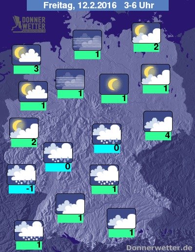 Am Freitag fällt im Südosten Deutschlands anfangs zeitweise Schnee, im Nordosten fällt bei oft dichten Wolken gebietsweise Regen oder Schnee. Im übrigen Bundesgebiet ist es zumeist aufgelockert, zum Teil auch locker bewölkt und es bleibt trocken. Gegen Abend werden die Wolken im Südwesten dichter und es kommt Regen, Schneeregen oder Schnee auf, dabei besteht Glättegefahr! Die Temperatur steigt auf 4 Grad im Grabfeld und bis 7 Grad im Rheinland.