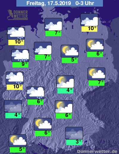 In der Nacht ist der Himmel über der West- und Nordwesthälfte meist bedeckt und immer wieder können Schauer fallen. In den übrigen Landesteilen bleibt es bei zunächst lockeren Wolken meist trocken; im weiteren Nachtverlauf kann sich vor allem in der Südhälfte verbreitet Nebel bilden.