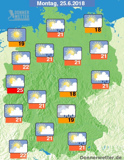 Heute zeigt sich in den westlichen Landesteilen häufig die Sonne und es ziehen hier meist nur lockere oder aufgelockerte Wolken durch. Weiter nach Osten hin werden die Wolken zahlreicher und zum Teil auch dicht, dazu können sich vereinzelt Schauer bilden, sonst bleibt es trocken. Die Temperatur erreicht 18 Grad an der Ostsee und bis 25 Grad in der Kölner Bucht.