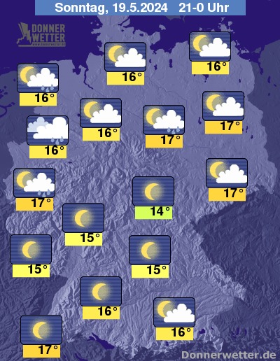 In der Nacht auf Montag sind im äußersten Westen und Nordwesten anfangs noch einzelne Schauer möglich, in den übrigen Landesteilen bleibt es bei sternenklarem Himmel oder nur geringer Bewölkung überwiegend trocken. Verbreitet kann sich in den frühen Morgenstunden Nebel bilden.