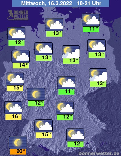 Die Temperaturen gehen bis Mitternacht zurück auf Werte um 13 Grad im Breisgau, 8 Grad an der Spree und 6 Grad im Thüringer Becken.