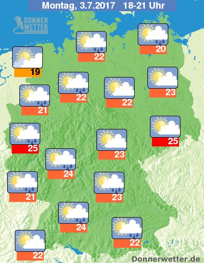 Heute Abend ist es im Norden und Westen teils heiter, teils ziehen aber auch dichte Wolken durch, dazu sind hier gebietsweise Schauer möglich. Über der Südosthälfte ist es größtenteils heiter, jedoch können sich im Süden bei regional dichteren Wolken auch vereinzelt Schauer bilden. Die Temperatur liegt bei 19 Grad in Cuxhaven und etwa 25 Grad in Bonn.