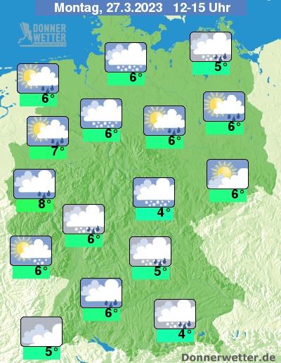 Heute Nachmittag zieht noch aufgelockerte, meist jedoch starke Bewölkung durch, dabei bilden sich vielerorts Schnee-, Schneeregen-, Regen- oder Graupelschauer. Die Temperatur liegt bei 4 Grad in München und 8 Grad in Düsseldorf.