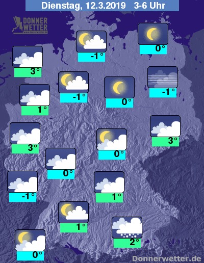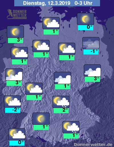 In der ersten Nachthälfte bleibt der Himmel zunächst meist locker oder aufgelockert bewölkt, an den Küsten sowie auf der Schwäbischen Alb ist es auch sternenklar. Im weiteren Nachtverlauf nimmt die Bewölkung vor allem in der Westhälfte zu. Zwischen Franken und dem Berchtesgadener Land muss in der Nacht mit Niederschlägen, die meist als Schneeregen oder Schnee fallen, gerechnet werden; sonst bleibt es meist trocken.