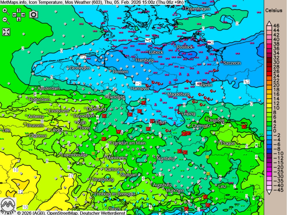 Die Wetter- / Temperaturkarten für 15:00 Uhr und 17:00 Uhr nach ICON: