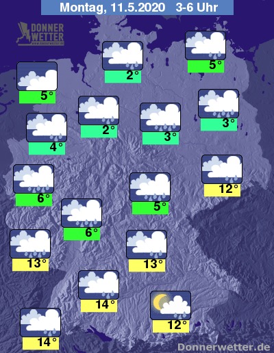 In der kommenden Nacht bleibt der Himmel verbreitet dicht bewölkt, dazu sind im Süden etwa bis Mitternacht noch gebietsweise Schauer und örtliche Gewitter möglich. Im übrigen Bundesgebiet fällt zeitweise Regen, wobei es bis in mittlere Lagen zum Teil auch schneien kann. Die Temperatur sinkt auf 14 Grad im Oberhreingraben und bis auf 2 Grad in der Norddeutschen Tiefebene.