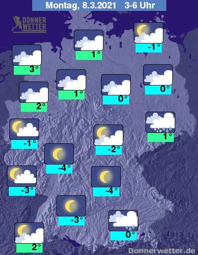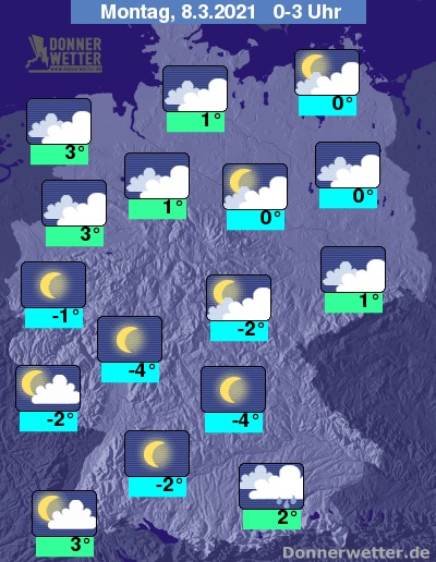 In den Nachtstunden verändert sich an der Wolkenverteilung nur wenig: Im Norden bleibt der Wolkendecke häufig geschlossen oder es ist aufgelockert bewölkt, im Süden wechseln sich verbreitet klarer Himmel mit lockeren Wolken ab. In den östlichen Mittelgebirgen sowie an den Alpen kann in den frühen Morgenstunden etwas Regen, Schneeregen oder Schnee fallen, sonst bleibt es meist trocken.