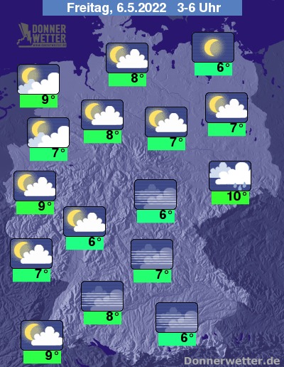 In der folgenden Nacht zeigt sich der Himmel über dem Land oft sternenklar und sonst meist locker bewölkt. Teils dichte Wolken sind jedoch über dem westlichen Niedersachsen und über Sachsen möglich, dabei kann es hier und da auch etwas regnen, sonst bleibt es aber trocken. Die Temperatur sinkt auf 10 Grad in Dresden und 6 Grad in Wiesbaden.