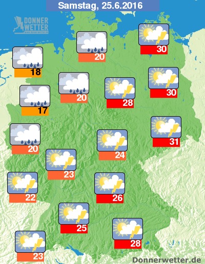 Heute ist es über dem Bundesgebiet häufig stark, hier und da aber auch aufgelockert bewölkt, dabei können sich verbreitet Schauer und örtliche Gewitter entwickeln. Über dem Nordwesten bleibt die Wolkendecke weitgehend verschlossen, hier fällt zeitweise Regen. Die Temperatur steigt auf 17 Grad an der Ems und bis auf 31 Grad im südlichen Brandenburg.