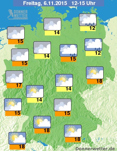 Am Nachmittag befinden sich heitere Abschnitte des Landes überwiegend im Süden. Bewölkt zeigt der Himmel sich im Nordwesten der Republik. An der Ostseeküste ist mit teilweise schweren Regenfällen zu rechnen. Die Temperaturen liegen bei Werten von 12 Grad C bis zu 18 Grad C.