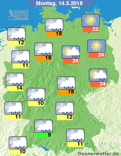 Der Montag zeigt sich über weite Landesteile hinweg verregnet und dicht bewölkt. Lediglich über dem Osten und Nordosten ist es größtenteils heiter bis sonnig und dabei trocken. Die Temperaur erreicht nur 9 Grad an der Schwäbischen Alb und bis 24 Grad in Berlin.