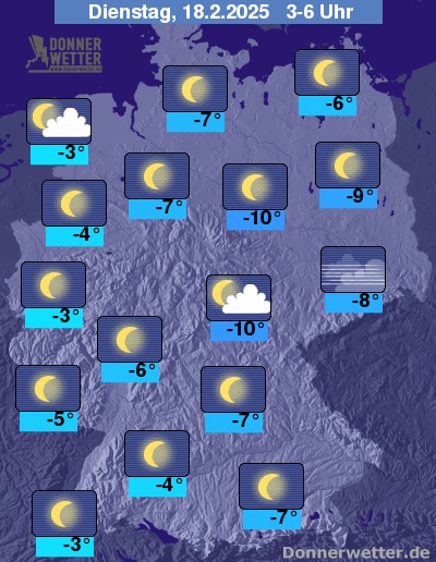 Die Temperaturen gehen zurück auf Werte um -3 Grad an der Nordseeküste, in den östlichen Mittelgebirgen strenger Frost bei Tiefstwerten teils unter -10 Grad.