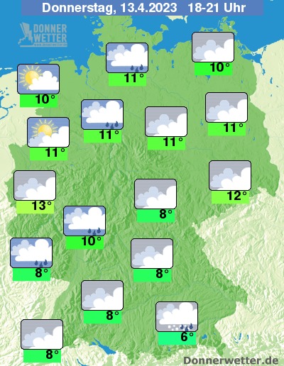 Heute Abend zeigt sich das Wetter fast ausnahmslos stark bis dicht bewölkt. Lediglich im Nordwesten sind längere Aufheiterungen möglich. Es bilden sich gebietsweise Schauer, an den Alpen können sich auch Schneeflocken in die Schauer zumischen. Die Temperatur liegt bei 6 Grad in München und bis 13 Grad in Köln.