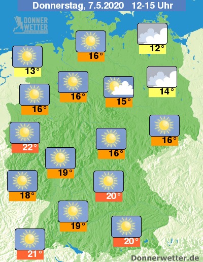 Die Temperaturen bewegen sich allgemein zwischen 15 und 20 Grad, etwas kühler bleibt es an den Küsten von Nord- und Ostsee, sowie unter den dichten Wolken in Brandenburg, angenehm warm wird es in den Ballungsgebieten des Westens.