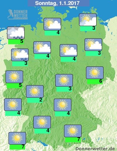 Am heutigen Neujahrstag scheint von der breiten Landesmitte bis in den Süden Deutschlands verbreitet die Sonne bei höchstens lockerer Bewölkung. Mehr und zunehmend auch dichte Wolken ziehen über den Norden und Nordwesten des Landes hinweg. Vom Niederrhein bis nach Schleswig-Holstein kann es zum Abend hin auch regnen, im übrigen Bundesgebiet bleibt es weitgehend trocken. Die Temperatur steigt auf 2 Grad am Westerwald und bis 7 Grad im Breisgau.