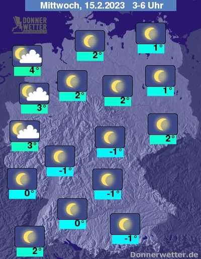 In der folgenden Nacht ist der Himmel zumeist sternenklar. Im Laufe der zweiten Nachthälfte nimmt im Westen und Nordwesten die Bewölkung etwas zu. Es bleibt bundesweit trocken bei Tiefstwerten von 4 Grad an der Nordsee und -1 Grad in Mittelfranken.