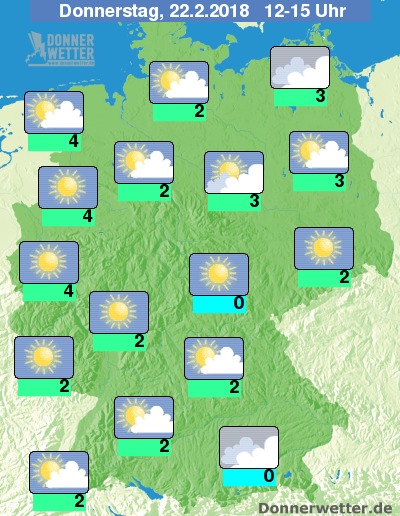 Zudem zeigt sich am Nachmittag ein eindeutiges Temperaturgefälle von Nordwest nach Südost. Während das Thermometer an der Nordsee und am Niederrhein auf Höchstwerte von bis zu 5 Grad klettert, bleibt das Thermometer am Alpenrand bereits knapp unter der 0 Grad Marke stehen. Dazu weht vor allem in der Südhälfte ein auffrischender Wind aus östlicher Richtung.