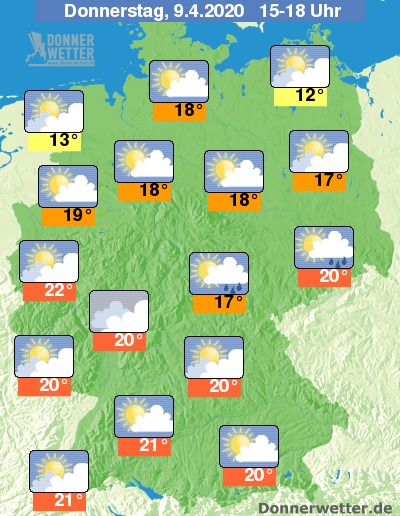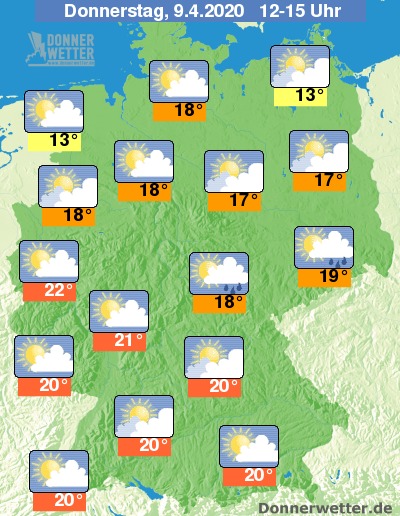 Bis zum Abend ändert sich an den Wetter- und Temperaturverhältnissen nur wenig. Allerdings können außer im Bereich der Mittelgebirge auch im Stau der Alpen, sowie in Norddeutschland einzelne Schauer auftreten.