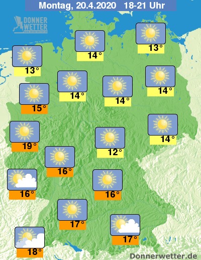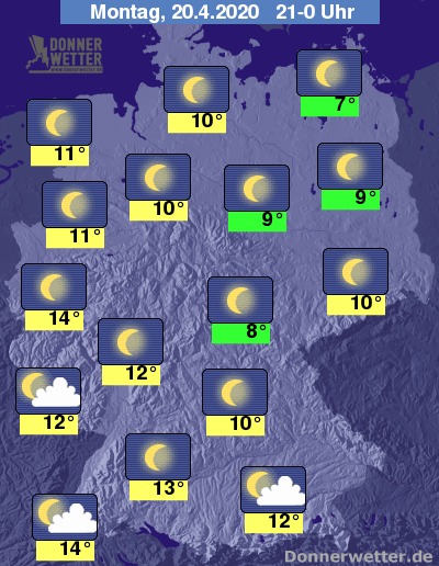 Bis zu ihrem Untergang scheint die Sonne am Abend von einem wolkenfreien Himmel, einzelne lockere Wolkenfelder beschränken sich in den Abendstunden auf den Südwesten und den Alpenrand. Es bleibt trocken. Der Wind weht weiterhin meist böig aus Ost, vereinzelt sind auch Sturmböen möglich.
