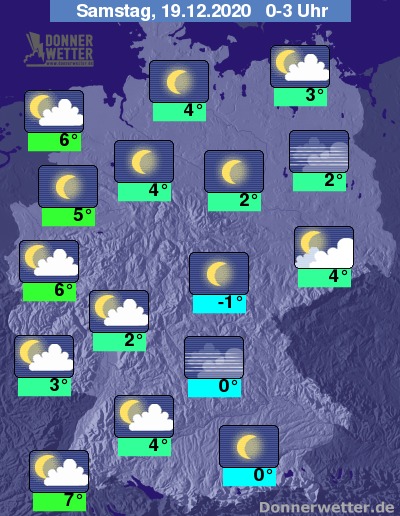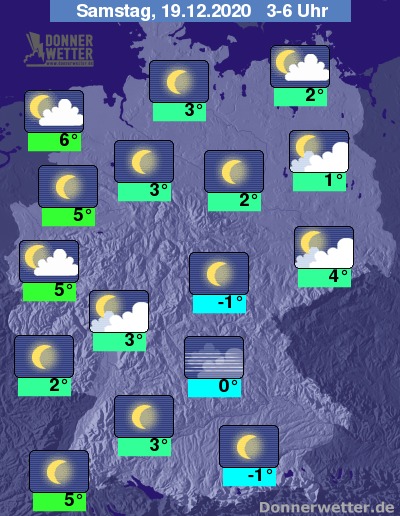 Die Temperaturen gehen auf 6 bis -1 Grad zurück, über der Landesmitte, sowie in Bayern gibt es auch leichten Frost und damit die Gefahr von Reifglätte, oder Glätte durch überfrierende Nässe in Verbindung mit Nebel. Am mildesten bleibt es im Markgräflerland, sowie von der Kölner Bucht bis zur Nordsee.