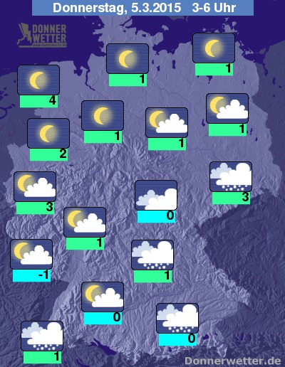 In den frühen Morgenstunden klart der Himmel dann vor allem in der Nordhälfte Deutschlands weiter auf. Im Süden Deutschlands kann zum Morgen hin vereinzelt Schneeregen oder Schnee fallen, 4 bis -1 Grad C.