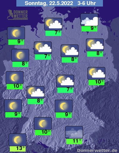 In der folgenden Nacht ist der Himmel im Ostseeumfeld zum Teil dicht bewölkt, im übrigen Norden und Osten ist es locker bewölkt und teils sternenklar. Im Süden und Westen ist es zum Großteil sternenklar oder es zieht nur geringe Bewölkung durch. Es bleibt landesweit trocken bei Tiefstwerten von 13 Grad in Freiburg und 7 Grad in Hamburg.