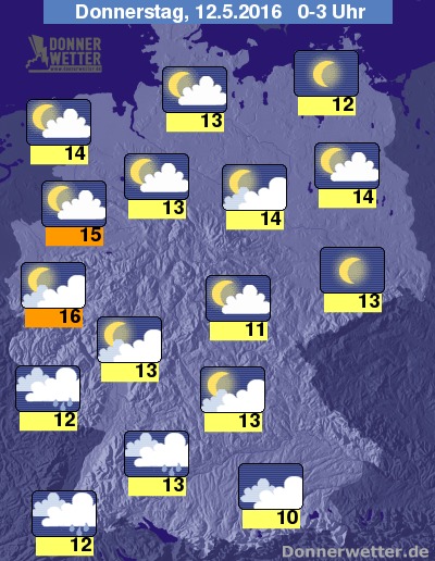In der zweiten Nachthälfte kommt es nur noch im äußersten Südwesten des Landes, von der Pfalz bis an die Schwäbische Alb, zu vereinzelten Niederschlägen. Im Rest des Landes ist der Nachthimmel in der Regel nur leicht bewölkt oder sogar sternenklar, wie an der Ostsee und im äußersten Osten. Die Temperaturen sinken dabei auf 10 Grad am Alpenrand und 16 Grad in der Kölner Bucht.
