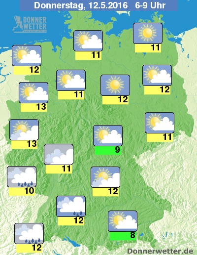 Der Donnerstagmorgen startet in weiten Teilen des Landes mit einer Mischung aus Sonne und Wolken. Lediglich im Südwesten setzt sich das Schauerrisiko der Nacht fort und sorgt für teils kräftigere Schauer. Im Süden liegen die Temperaturen in den Morgenstunden bei frischen 8 Grad, während es entlang des Rheins mit 13 Grad vergleichsweise mild bleibt.