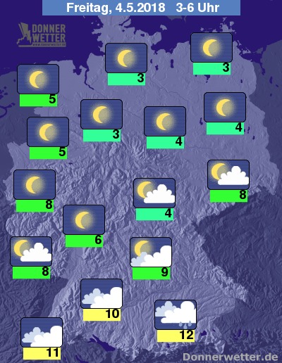Dabei fallen die Temperaturen im Norden unter sternenklarem Himmel im Lauf der Nacht rasch ab und liegen am frühen Morgen bei Werten um die 3 Grad. Im Süden bleibt es unter einer dichten Wolkendecke mit 10 bis 12 Grad hingegen wesentlich milder.