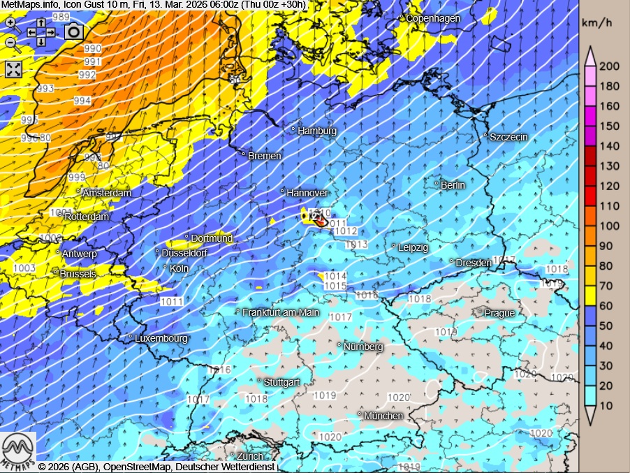 Die Wetter-, Temperatur- und Böenkarte für Freitagfrüh (06:00) sowie die 24-Stunden-Regenmengen nach ICON: