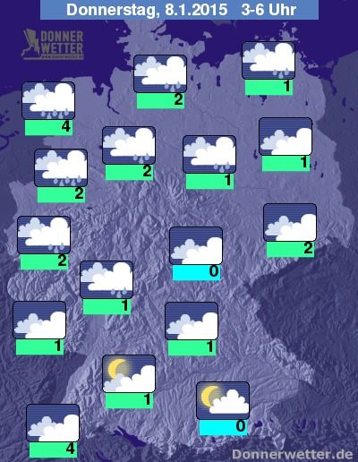 In der Nacht zum Donnerstag ziehen die dichten Regenwolken aus Nordwesten weiter in Richtung der Landesmitte. Bis zum Morgen bleibt es voraussichtlich nur im Süden des Landes weitgehend trocken, sonst fällt bei meist dichten Wolken zeitweise Regen, im Osten und der Landesmitte teils auch Schneeregen oder Schnee, dabei besteht Glättegefahr. Die Temperatur sinkt auf 4 Grad an der Wesermündung und bis 0 Grad am Alpenrand. Im Norden weht ein teils starker, an den Küsten ein starker bis stürmischer Wind.