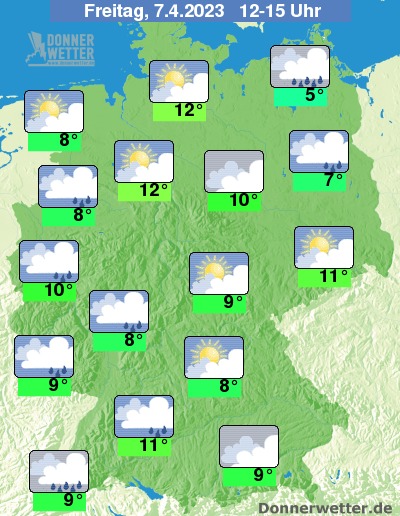 Heute Nachmittag zeigt sich das Wetter oft wechselhaft mit oft dichten Wolken, jedoch auch Aufheiterungen vor allem in einem Streifen von Niedersachsen bis nach Thüringen, Sachsen und Nordbayern, hier bleibt es meist trocken. Im übrigen Land fällt gebietsweise Regen. Die Temperatur liegt bei 5 Grad auf Rügen und 11 Grad im Raum Stuttgart.