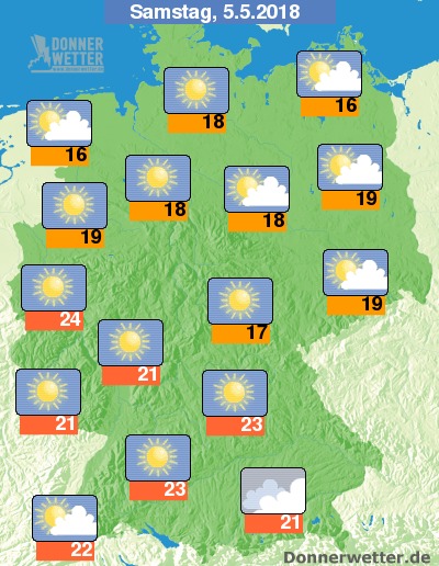 Heute ist es verbreitet heiter oder sonnig, im Alpenvorland ziehen jedoch gebietsweise dichte Wolken durch, es bleibt aber auch hier trocken. Die Temperatur erreicht 16 Grad auf Rügen und bis 24 Grad im Rheinland.