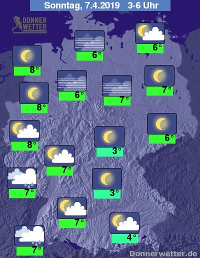 In der Nacht zum Sonntag zeigt sich der Himmel besonders über der Nordosthälfte der Republik verbreitet sternenklar. Weiter nach Südwesten hin ziehen mehr und vor allem im Südwesten auch meist dichte Wolken durch, die hier bevorzugt während der zweiten Nachthälfte regional Regen bringen können. Im übrigen Land bleibt es trocken bei Tiefstwerten von 8 Grad am Niederrhein und bis 3 Grad im Vogtland.