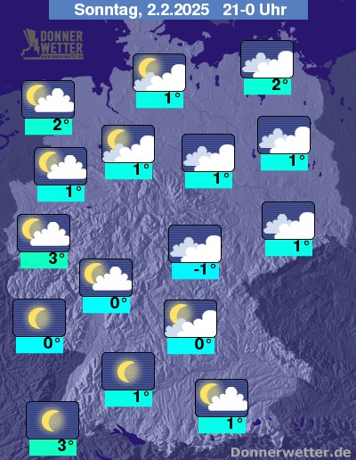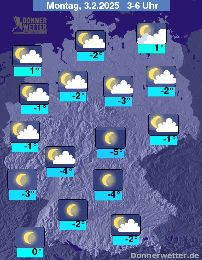 In der Nacht zum Montag ist der Himmel teils stark bewölkt oder neblig-trüb, teils sternenklar oder nur gering bewölkt. Es bleibt niederschlagsfrei.