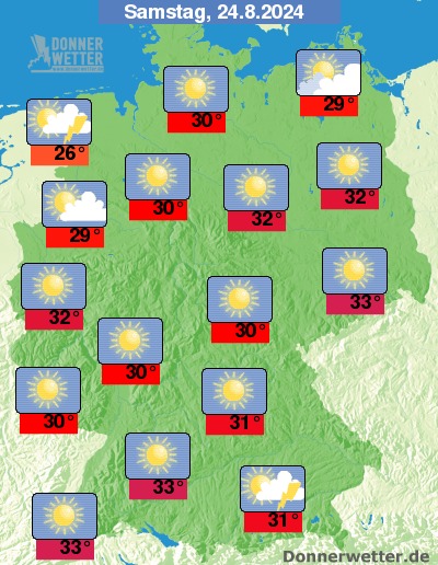 Die Temperaturen erreichen am Nachmittag Höchstwerte um 26 Grad an der Nordseeküste und 33 Grad am Oberrhein.