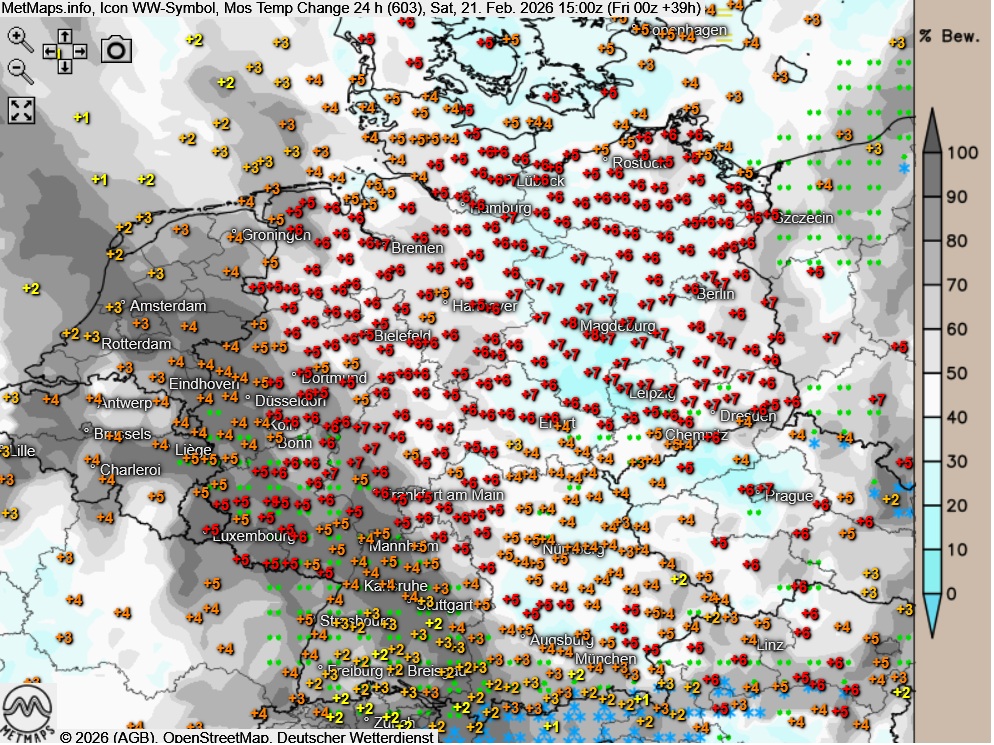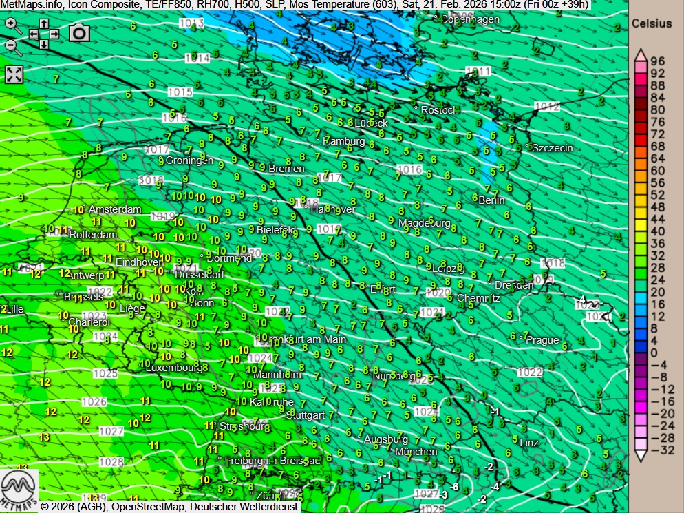 Die Wetterkarte mit den 24-Stunden-Temperaturveränderungen sowie die Stömungs- / Temperaturkarte für Samstagnachmittag (15:00 Uhr) nach ICON:
