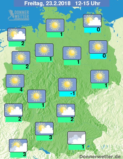 Durch den stärker werdenden Einfluss sibirischer Luftmassen und einen teils kräftigen Ostwind steigen die Temperaturen im Tagesverlauf nur leicht an. Die Höchstwerte liegen am Nachmittag entsprechend zwischen -1 Grad in Teilen Thüringens und +4 Grad an Rhein und Donau.