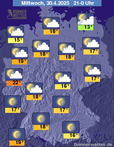 Am Mittwochnachmittag zeigt sich der Himmel über dem Norden und Nordosten sonnig, zeitweise können auch mal lockere Wolkenfelder durchziehen. In den übrigen Landesteilen scheint die Sonne am Nachmittag von einem meist wolkenlosen Himmel. Im südlichen Bergland sowie in den Alpen besteht ein geringes Schauer- und Gewitterrisiko.