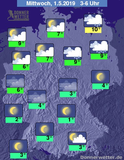 In der Mainacht erwartet den Baumstellern meist ein trockener Weg. Bis auf den Nordosten um Brandenburg und der Ostseeküste sind Schauer oder Regen zu erwarten. Im Süden ist es meist klar und in der Mitte des Landes bildet sich bei Temperaturen um den Gefrierpunkt Nebel.