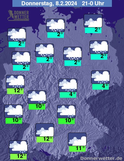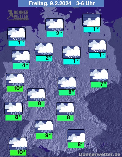 In der Nacht auf Freitag bleibt es an der Ostseeküste sowie im äußersten Südosten bei einzelnen Auflockerungen meist trocken; sonst zeigt sich der Himmel überwiegend bedeckt und es ist regnerisch, von den Ostfriesischen Inseln bis nach Brandenburg fällt auch Schneeregen oder Schnee.
