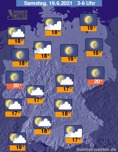 In der kommenden Nacht bilden sich über der Westhälfte des Landes noch einzelne Schauer und örtlich auch Gewitter. Weiter nach Osten hin ist es überwiegend sternenklar und dazu trocken. Nach Mitternacht bleibt es bei dann meist lockerer bis aufgelockerter Bewölkung auch im übrigen Land trocken. Die Temperatur sinkt auf tropische 20 Grad in Köln und bis 17 Grad in Erfurt.