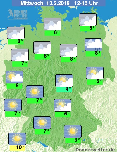 Am Nachmittag halten sich in der Nordhälfte meist dichte, zähe Schichtwolken einer schwachen Warmfront, aus der es stellenweise auch etwas tröpfeln oder nieseln kann. In der Mitte wechseln sich Sonne und Wolken miteinander ab. Nach Süden und Südwesten wird es immer freundlicher und die Sonne schein längere Zeit.
